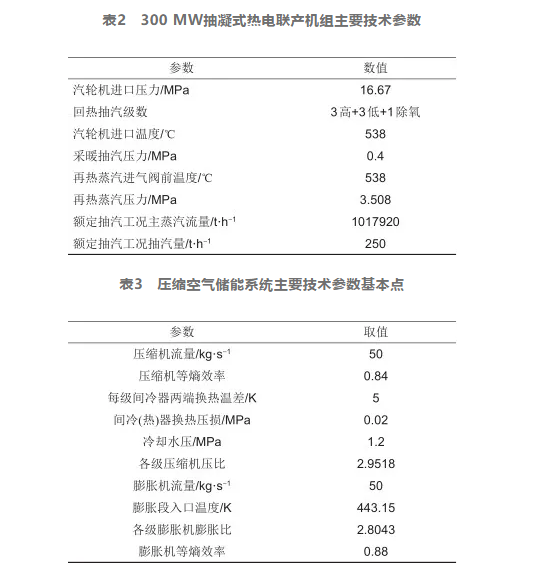 在搭建新型集成系統(tǒng)模型時,對于火電廠抽凝式熱電聯(lián)產(chǎn)機組和壓縮空氣儲能子系統(tǒng)的模型搭建,采取的主要技術(shù)參數(shù)見表2、表3。