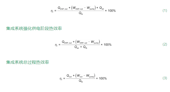 式中,QESP,out為集成系統(tǒng)強化供熱階段的輸出熱負荷,W;WESP,out為集成系統(tǒng)強化供熱階段的輸出功率,W;Wpump為泵附件耗功熱值,W;QERP,out為集成系統(tǒng)強化供電階段的輸出熱負荷,W;WERP,out為集成系統(tǒng)強化供電階段的輸出功率,W。