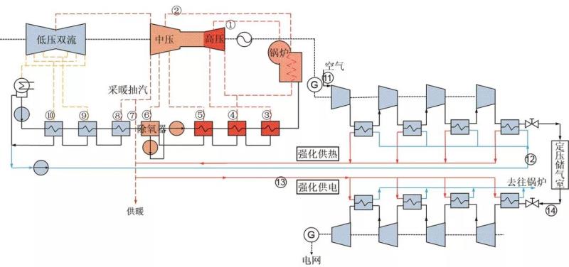 將兩個子系統(tǒng)耦合時,遵循溫度對等和能量梯級利用原則,利用熱電廠冷凝水作為壓縮空氣儲能系統(tǒng)的冷卻循環(huán)水,熱電廠采暖抽汽作為膨脹機前高壓空氣的加熱熱源。該系統(tǒng)同時解決了供電供熱的負荷平衡問題;通過引入壓縮空氣儲能可實現(xiàn)抽凝式熱電聯(lián)產(chǎn)機組始終保持于額定工況下運行,提升其運行效率;而且熱電聯(lián)產(chǎn)機組與壓縮空氣儲能之間熱、電的深度耦合,使得抽凝式熱電聯(lián)產(chǎn)機組的熱電解耦能力得到極大提升,增強了機組運行靈活性。