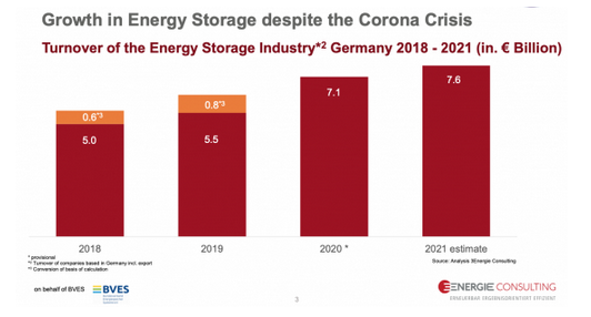 Energie Consulting公司的調(diào)查發(fā)現(xiàn),德國(guó)2019年住宅儲(chǔ)能市場(chǎng)的營(yíng)業(yè)額約為6.6億歐元,而到2020年增長(zhǎng)了60%,增長(zhǎng)到11億歐元。之所以有這樣的大幅增長(zhǎng),部分原因是人們對(duì)能源彈性、自給自足和安全以及供電獨(dú)立性的興趣增加。