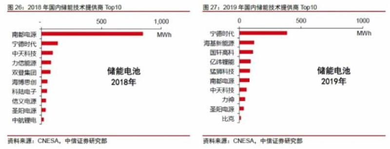 對比2018-2019年中國儲(chǔ)能技術(shù)提供商(即電池提供商)Top10企業(yè)的變化即可看到,寧德時(shí)代、國軒高科、億緯鋰能等國內(nèi)動(dòng)力電池領(lǐng)先企業(yè),儲(chǔ)能裝機(jī)量均在2019年取得了明顯的同比增長。