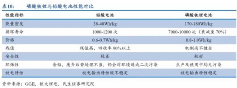 磷酸鐵鋰電池能量密度可達(dá)鉛酸電池的4-5倍,且在安全性、循環(huán)壽命、快速充放性能等方面優(yōu)勢明顯。盡管目前磷酸鐵鋰電池價(jià)格仍高于鉛酸電池,但在全生命周期成本評價(jià)體系下,由于擁有更長的循環(huán)壽命,磷酸鐵鋰電池已幾乎抹平了成本劣勢,且未來幾年仍有降本空間。