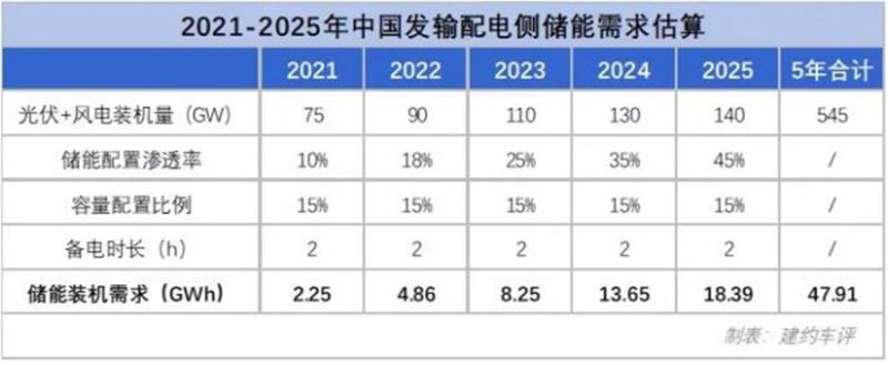 以光伏+風(fēng)電裝機(jī)增量為測算依據(jù),并考慮儲(chǔ)能配置滲透率逐漸提升,容量配置比例取15%,容量時(shí)長取2小時(shí),預(yù)計(jì)我國2021-2025年發(fā)輸配電側(cè)(即電表前端)的儲(chǔ)能裝機(jī)需求約為48GWh。