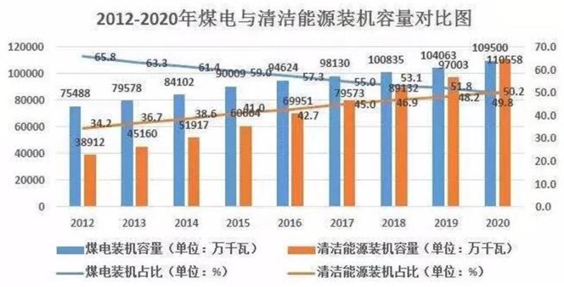 值得注意的是,在連續(xù)多年的清潔發(fā)電高速增長和煤電緩增長后,2020年底,中國煤電總裝機(jī)容量占比首次下降到50%以下。