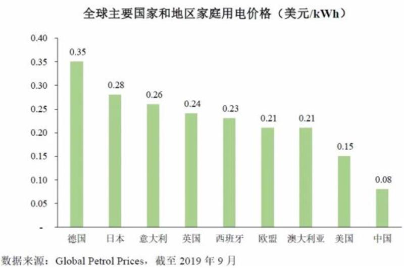 與中國相比,一些發(fā)達(dá)國家的居民用電成本高昂。根據(jù)Global Petrol Prices數(shù)據(jù),德國、日本、英國、澳大利亞和美國的居民用電均價(jià)分別為0.38、0.29、0.26、0.25和0.15美元/kWh,而中國民用電價(jià)僅為0.08美元/kWh。