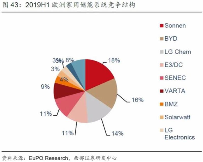 根據(jù)EuPO Research數(shù)據(jù),2019年上半年,比亞迪在歐洲家用儲(chǔ)能系統(tǒng)的市場份額為16%,僅排在Sonnen之后位列第二。