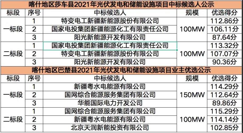 4月1日,新疆喀什莎車縣與巴楚縣公示了2021年450MW光伏發(fā)電和儲能設施項目中標候選人,特變電工、國家電投、新疆粵水電以及國網綜合能源分別位列四個標段的第一中標候選人。具體公示結果見下: