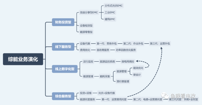 從服務(wù)形態(tài)上看,目前市場上主要是兩個方向,第一個相對比較傳統(tǒng),就是投資+運維模式,比如光伏的投資+運維,或者EMC項目疊加后續(xù)運維服務(wù)。但是這種服務(wù)的深度相對較淺,關(guān)注重點主要還是所投資的資產(chǎn),而非客戶的資產(chǎn)或者需求。