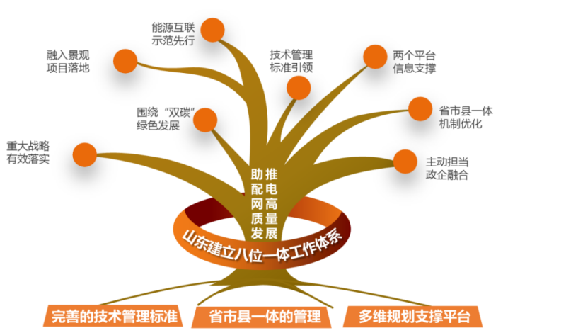 構(gòu)建“戰(zhàn)略落實(shí)、綠色發(fā)展、著眼落地、示范先行、標(biāo)準(zhǔn)引領(lǐng)、信息支撐、機(jī)制優(yōu)化、政企融合”的八位一體工作體系,清單化推動(dòng)8項(xiàng)政府重大戰(zhàn)略落地,組建新能源及儲(chǔ)能發(fā)展專班,制定電力設(shè)施與城市建筑和管廊協(xié)調(diào)融合發(fā)展指導(dǎo)意見,打造4類能源互聯(lián)網(wǎng)示范區(qū),構(gòu)建含“26項(xiàng)標(biāo)準(zhǔn)、省市縣一體、兩個(gè)平臺(tái)”的規(guī)劃技術(shù)、管理、信息支撐體系,主動(dòng)承擔(dān)政府能源電力規(guī)劃,推動(dòng)配電網(wǎng)高質(zhì)量發(fā)展。