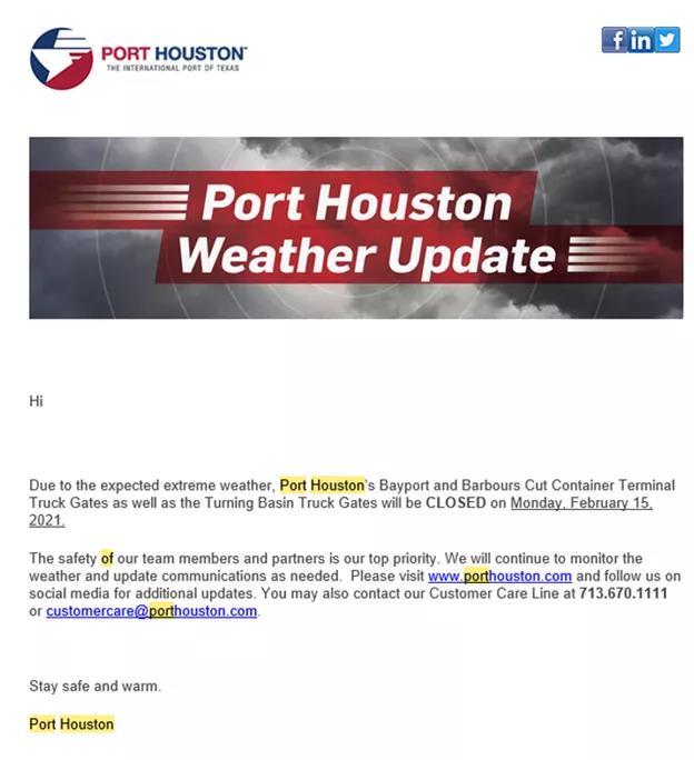 孟靜惟:2月12日下午,工作原因收到了休斯頓港口周一停運的郵件,一批物資正卡在港口,焦頭爛額調整生產(chǎn)計劃擔心物資短缺。下班時間收到通知需要帶上工作電腦回家以防周一有雪可在家辦公。