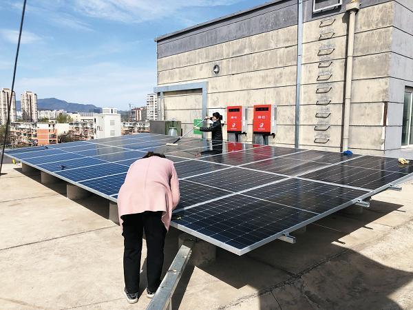 記者看到,兩名保潔人員正在清潔電池板。原來(lái)雨雪、沙塵會(huì)影響設(shè)備的發(fā)電效率,所以對(duì)于電池板的日常維護(hù)非常重要。據(jù)國(guó)網(wǎng)廣匯工作人員介紹,樓頂這些光伏設(shè)備在天氣條件好的情況下,每天可發(fā)電約550kWh。因此,門店可根據(jù)自己日常用電量測(cè)算需要設(shè)置多少設(shè)備,比如駿寶行未來(lái)用電負(fù)荷加大,還可以在配樓樓頂增加光伏設(shè)備,提高光伏能源供應(yīng)量,余電并網(wǎng)也可產(chǎn)生額外收益。