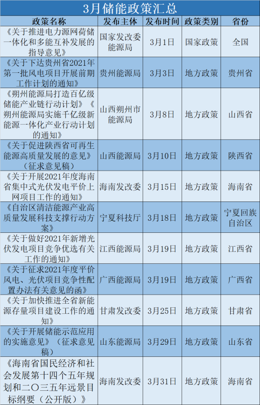 而儲能布局不多,政策性文件較少的江西省也出臺了《關(guān)于做好2021年新增光伏發(fā)電項目競爭優(yōu)選有關(guān)工作的通知》,明確儲能具體配置比例為10%。