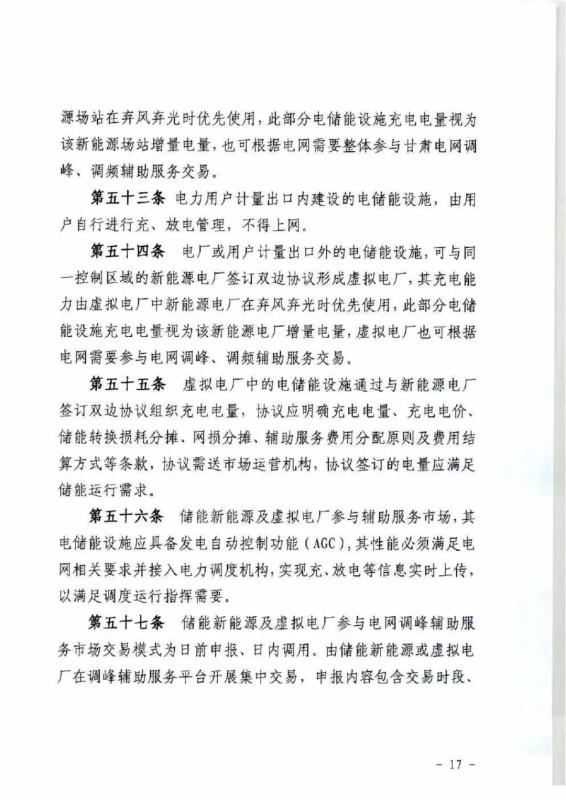 在新能源場站計量出口內(nèi)建設(shè)的5MW/10MWh及以上電儲能設(shè)施,可與新能源場站作為整體,參與調(diào)峰、調(diào)頻輔助服務(wù)市場。其充電電量可優(yōu)先使用新能源棄風(fēng)棄光電量,且視為新能源場站增發(fā)電量。