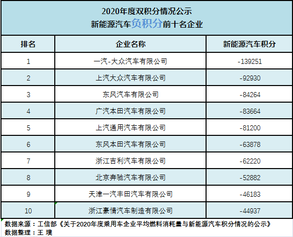 具體到每家企業(yè),新能源汽車(chē)正負(fù)積分在2020年的分化則更加明顯。