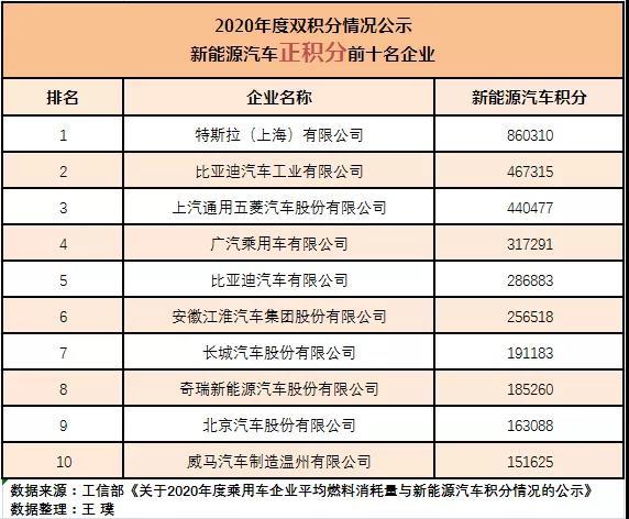公示報(bào)告顯示,2020年特斯拉以超過(guò)86萬(wàn)的新能源汽車(chē)正積分,成為獲得新能源汽車(chē)正積分最多的乘用車(chē)企,比亞迪和上汽通用五菱兩家自主品牌乘用車(chē)企的新能源汽車(chē)正積分?jǐn)?shù)量分別位居第二和第三,盡管正積分量都在40萬(wàn)分以上,但與特斯拉的差距還是十分明顯。另外,公示的報(bào)告顯示,2020年,國(guó)內(nèi)乘用車(chē)企中仍有20家企業(yè)的新能源汽車(chē)積分為零。
