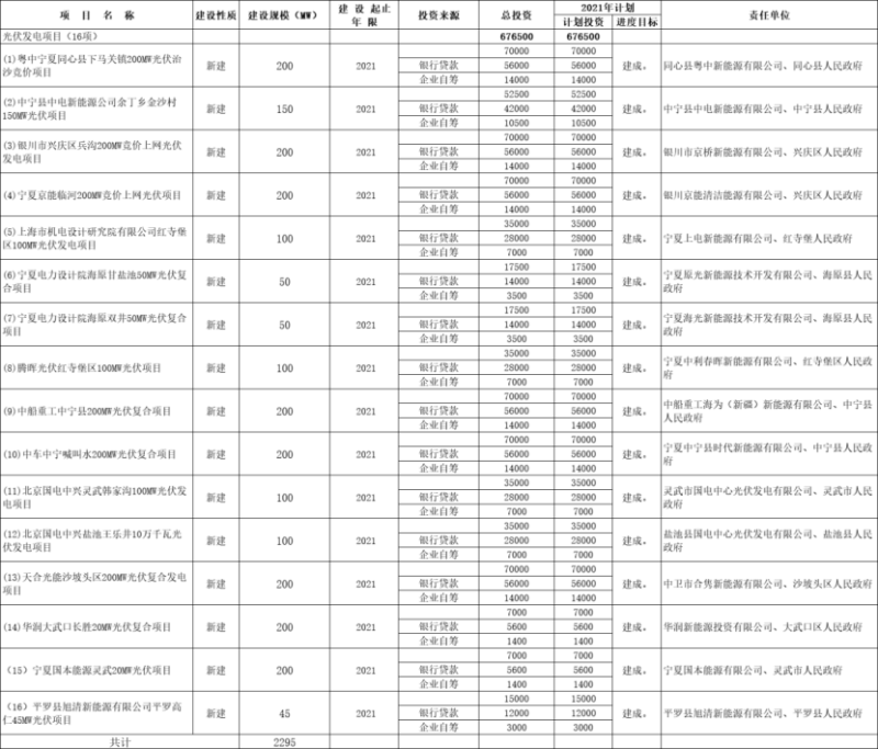 中國儲(chǔ)能網(wǎng)訊:4月7日,寧夏自治區(qū)發(fā)展改革委關(guān)于印發(fā)《2021年自治區(qū)重點(diǎn)項(xiàng)目投資計(jì)劃》的通知,據(jù)光伏們整理,其中光伏電站項(xiàng)目16個(gè),涉及項(xiàng)目業(yè)主包括中國電建、隆基、京能、天合光能、華潤等多家企業(yè),總規(guī)模達(dá)2.295GW。項(xiàng)目分布在寧夏自治區(qū)的同心縣、中寧縣、興慶區(qū)、紅寺堡、海原縣、靈武市、鹽池縣、沙坡頭區(qū)、大武口區(qū)、平羅縣等地,項(xiàng)目總投資規(guī)模67.65億元。