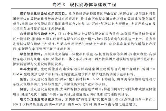 “十四五”時期,山西省實現(xiàn)綠色能源供應體系基本形成。能源革命綜合改革試點取得明顯成效,煤炭綠色智能安全開采和高效清潔深度利用居于全國領先水平,能源優(yōu)勢特別是電價優(yōu)勢進一步轉(zhuǎn)化為比較優(yōu)勢、競爭優(yōu)勢。