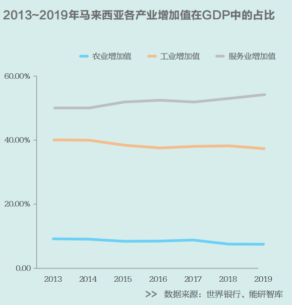 產業(yè)結構方面,作為曾經的“亞洲四小虎”之一,馬來西亞第三產業(yè)占GDP比重較高。2013~2019年,農業(yè)增加值在GDP中的占比由9.11%降至7.26%,工業(yè)增加值在GDP中的占比從39.89%降至37.40%,服務業(yè)增加值在GDP中的占比從49.94%升至54.21%。