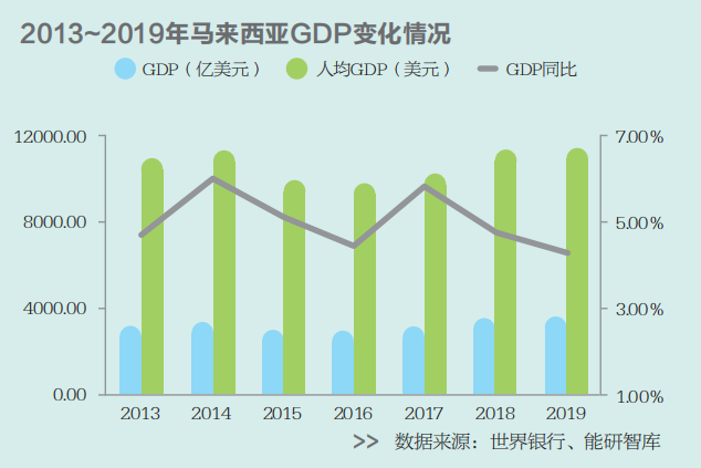 總體看,馬來西亞經濟基本呈現(xiàn)穩(wěn)定增長態(tài)勢,2013~2019年,國民生產總值(GDP)同比增速基本維持在4%~6%,人均國民收入約為45034林吉特(約合人民幣17153元)。