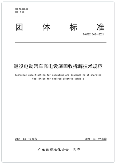 4月19日,廣東省標準化協(xié)會發(fā)布團體標準《退役電動汽車充電設施回收拆解技術規(guī)范》,為日漸增多的電動汽車充電設施的回收拆解提供技術支撐。