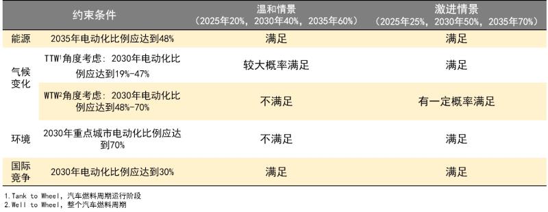 采用自上而下的方法,根據(jù)能源、氣候變化、環(huán)境、國際競爭四個方面的外部約束提出關(guān)鍵節(jié)點的電動化發(fā)展目標(biāo)。提出兩種情景模式,一是溫和情景目標(biāo)下,2025年新能源汽車銷量占比應(yīng)達(dá)到20%,2030年占比40%,2035年占比60%;二是激進(jìn)情景目標(biāo)下2025年新能源汽車銷量占比應(yīng)達(dá)到25% ,2030年占比50%,2035年70%。
