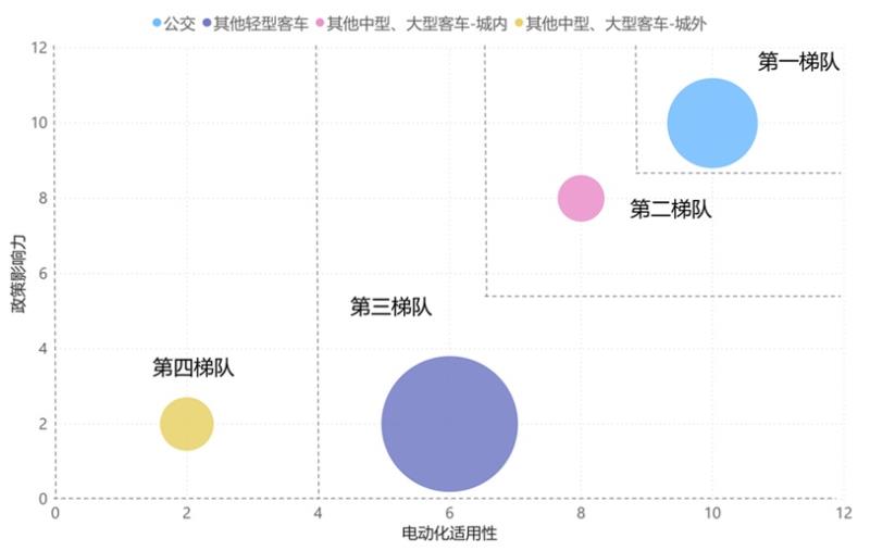 根據(jù)國家和地方政策、規(guī)劃中的重點推進(jìn)應(yīng)用場景,得到各車型的政策影響力大小,結(jié)合經(jīng)濟(jì)性分析和主要應(yīng)用場景特征得到各車型電動化適用性,綜合分析得到分車型推進(jìn)次序,我們按電動化推進(jìn)次序?qū)⑸逃密嚉w納為四個梯隊: