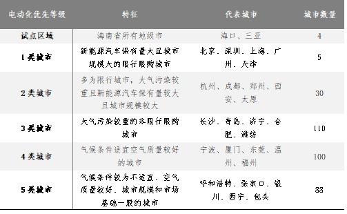 分區(qū)域電動化實現(xiàn)路徑:采用聚類算法將337個地級以上城市按電動化優(yōu)先等級劃分為五大類(如圖3所示)??紤]到我國地域遼闊,城市間情況差異較大,因此在汽車電動化發(fā)展目標(biāo)的實現(xiàn)路徑上有必要分區(qū)域進(jìn)行推進(jìn)。我們考慮大氣污染治理的緊迫程度、氣候條件、新能源汽車市場基礎(chǔ)、政策基礎(chǔ)和城市規(guī)模5類關(guān)鍵影響因素,采用聚類算法進(jìn)行城市電動化優(yōu)先等級劃分,具體劃分結(jié)果如下表所示。