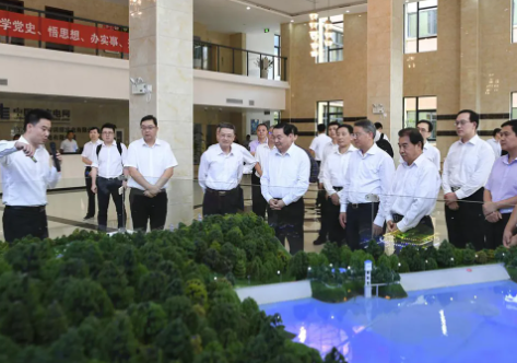 4月19日,國務(wù)院國資委黨委書記、主任郝鵬一行在海南瓊中抽水蓄能電站沙盤模型前聽取匯報。(南網(wǎng)傳媒全媒體記者 周志旺攝)