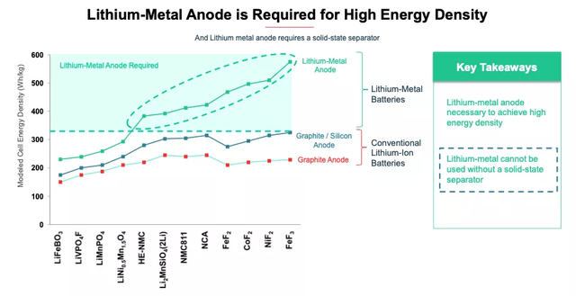 圖1|采用不同材料得到的理論能量密度上限,金屬鋰負(fù)極可以做到 350 - 500 Wh/Kg(圖片來(lái)源:Battery ShowCase, QuantumScape, 2020.12)