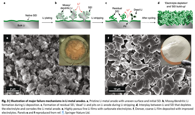 圖2|金屬鋰負(fù)極令人困擾的鋰枝晶問(wèn)題(圖片來(lái)源:Liu et al., Pathways for practical high-energy long-cycling lithium metal batteries, Nature Energy, 2019)