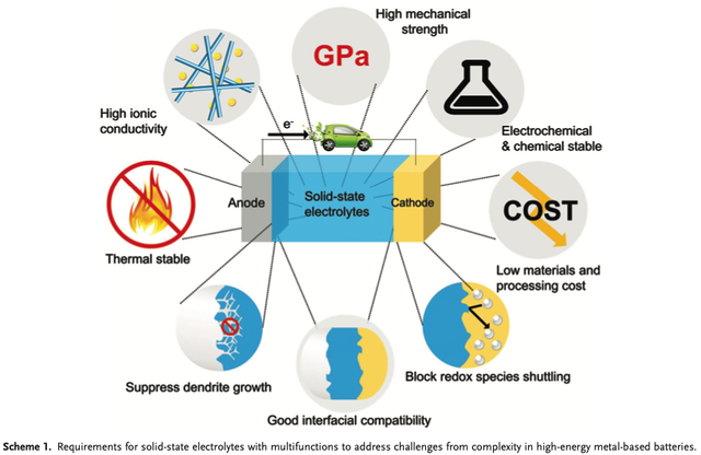圖4|理想的固態(tài)電解質(zhì)性能(圖片來(lái)源:Fan et al., Recent Progress of the Solid-State Electrolytes for High-Energy Metal-Based Batteries, Advanced Energy Materials, 2018)