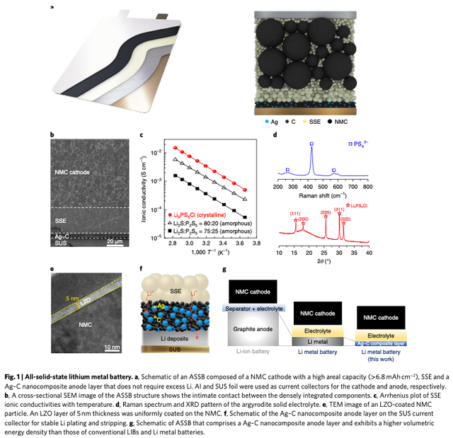 2020 年 3 月,三星電子旗下 Samsung Advanced Institute of Technology(SAIT)在 Nature Energy 期刊發(fā)表固態(tài)電池研究進(jìn)展論文,提出了一種以銀-碳復(fù)合薄層作為負(fù)極、以硫化物材料為固體電解質(zhì),以高鎳三元材料為正極的新型電池材料體系,在無(wú)過(guò)量鋰添加的條件下,這種容量 0.6 Ah 的原型電池實(shí)現(xiàn)了超過(guò) 900 Wh/L 的體積能量密度,超過(guò) 99.8% 的庫(kù)倫效率,以及長(zhǎng)達(dá) 1000 次的循環(huán)壽命。