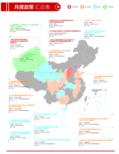 從地方來看,安徽省《關(guān)于建立安徽省可再生能源發(fā)展三年行動計劃項(xiàng)目庫(2021-2023 年)的通知》、陜西省《關(guān)于促進(jìn)陜西省可再生能源高質(zhì)量發(fā)展的意見》(征求意見稿)、貴州省《關(guān)于下達(dá)貴州省2021年第一批風(fēng)電項(xiàng)目開展前期工作計劃的通知》和《貴州省風(fēng)電光伏發(fā)電項(xiàng)目管理暫行辦法》、海南省《關(guān)于開展2021年度海南省集中式光伏發(fā)電平價上網(wǎng)項(xiàng)目工作的通知》、新疆自治區(qū)《關(guān)于有序推動2021年新增風(fēng)電、光伏發(fā)電項(xiàng)目競爭優(yōu)選相關(guān)工作的通知》、江西省《關(guān)于做好2021年新增光伏發(fā)電項(xiàng)目競爭優(yōu)選有關(guān)工作的通知》、廣西省《關(guān)于征求2021年度平價風(fēng)電、光伏項(xiàng)目競爭性配置辦法有關(guān)意見的函》、甘肅省《關(guān)于加快推進(jìn)全省新能源存量項(xiàng)目建設(shè)工作》、山東省《關(guān)于開展儲能示范應(yīng)用的實(shí)施意見(征求意見稿)》等都再次重申了新能源與儲能協(xié)同配置需求。山西省朔州市《朔州市能源局打造百億級儲能產(chǎn)業(yè)鏈行動計劃》以及《甘肅省國民經(jīng)濟(jì)和社會發(fā)展第十四個五年規(guī)劃和二〇三五年遠(yuǎn)景目標(biāo)綱要》都分別從儲能產(chǎn)業(yè)發(fā)展和儲能技術(shù)應(yīng)用角度提出了宏偉目標(biāo)。隨著棄電緩解,部分地區(qū)新能源規(guī)模化建設(shè)再次啟動,這又將帶來新的消納和穩(wěn)定系統(tǒng)供應(yīng)問題出現(xiàn),而要求新增項(xiàng)目配置儲能的商業(yè)化問題也急需得到解決,這為區(qū)域新能源的高質(zhì)量發(fā)展提出了更高的要求。寧夏在印發(fā)《關(guān)于加快促進(jìn)自治區(qū)儲能健康有序發(fā)展的指導(dǎo)意見(征求意見稿)》之后,本月發(fā)布《自治區(qū)清潔能源產(chǎn)業(yè)高質(zhì)量發(fā)展科技支撐行動方案》,現(xiàn)提出支持電池技術(shù)研發(fā)和系統(tǒng)集成技術(shù)應(yīng)用。