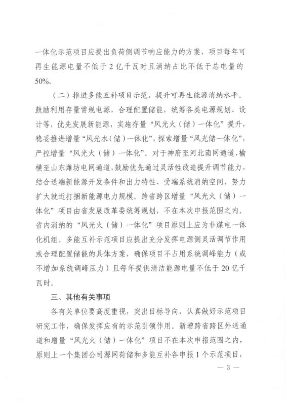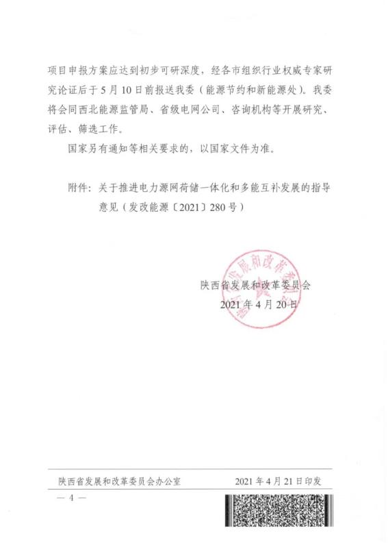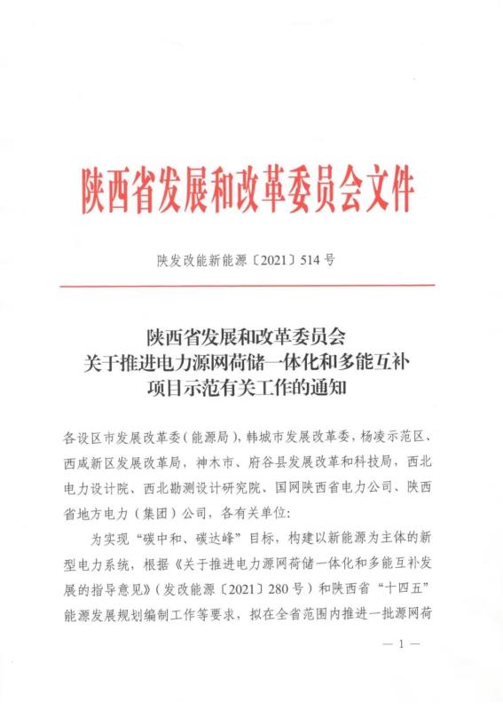 中國儲能網(wǎng)訊:4月20日,陜西省發(fā)改委發(fā)布《關(guān)于推進電力源網(wǎng)荷儲一體化和多能互補項目示范有關(guān)工作的通知》。文件提出要求:源網(wǎng)荷儲一體化示范項目應(yīng)提出負荷側(cè)調(diào)節(jié)響應(yīng)能力的方案,項目每年可再生能源電量不低于2億千瓦時且消納占比不低于總電量的50%;多能互補示范項目應(yīng)提出充分發(fā)揮電源側(cè)靈活調(diào)節(jié)作用或合理配置儲能的具體方案,確保項目不占用系統(tǒng)調(diào)峰能力(或不增加系統(tǒng)調(diào)峰壓力)且每年提供清潔能源電量不低于20億千瓦時。原則上一個集團公司源網(wǎng)荷儲和多能互補各申報1個示范項目,項目申報方案經(jīng)權(quán)威專家研究論證后于5月10日前報送。