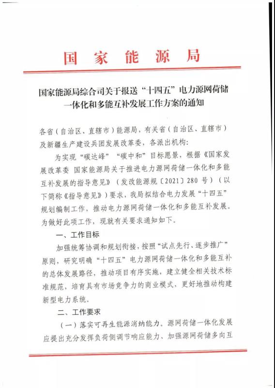 中國儲能網(wǎng)訊:4月25日,國家能源局綜合司向各省市發(fā)改委及能源局印發(fā)《關(guān)于報送“十四五”電力源網(wǎng)荷儲一體化和多能互補工作方案的通知》,就“碳達(dá)峰”、“碳中和”目標(biāo)下推動電力源網(wǎng)荷儲一體化和多能互補發(fā)布給出指導(dǎo)意見。