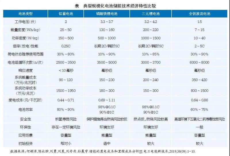 電化學(xué)儲(chǔ)能主要包括鉛蓄電池、鋰離子電池、液流電池、鈉硫電池等。目前用于規(guī)模化儲(chǔ)能的電池主要以鉛蓄、鋰離子和全釩液流電池為主,這三類典型規(guī)?;瘍?chǔ)能電池的技術(shù)經(jīng)濟(jì)特性如表所示。從表中各項(xiàng)指標(biāo)的綜合比較可以得出各電池技術(shù)參數(shù)的優(yōu)劣勢。綜合各項(xiàng)指標(biāo)數(shù)據(jù)來看,磷酸鐵鋰電池相對(duì)更優(yōu),是當(dāng)前我國電池儲(chǔ)能技術(shù)推廣應(yīng)用的主流技術(shù)。此外,相比較抽水蓄能等其他儲(chǔ)能方式,電池儲(chǔ)能電站具有以下五個(gè)方面的優(yōu)勢:第一,設(shè)計(jì)靈活、配置方便,采用模塊化設(shè)計(jì),基本上不受地理?xiàng)l件的限制;第二,響應(yīng)速度快,毫秒級(jí)時(shí)間尺度內(nèi)實(shí)現(xiàn)額定功率范圍內(nèi)的有功無功的輸入和輸出;第三,精準(zhǔn)控制,能夠在可調(diào)范圍內(nèi)的任何功率點(diǎn)保持穩(wěn)定輸出;第四,具有雙向調(diào)節(jié)能力,既可以充電作為用電負(fù)荷,又可以放電作為電源,具有額定功率雙倍的調(diào)節(jié)能力;第五,電池儲(chǔ)能電站技術(shù)相對(duì)成熟,建設(shè)周期短,能夠快速響應(yīng)應(yīng)用需求。正是由于電池儲(chǔ)能技術(shù)具有上述優(yōu)勢,使得其廣泛應(yīng)用于配合平抑新能源出力波動(dòng)、提高電能質(zhì)量、削峰填谷、調(diào)峰調(diào)頻、提高供電能力、提高孤立電網(wǎng)穩(wěn)定性及作為應(yīng)急備用電源提供供電可靠性等多個(gè)方面。