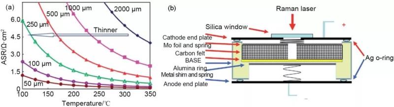 圖16 (a) 不同厚度β"-Al2O3陶瓷電解質(zhì)的離子電導(dǎo)率隨溫度的變化趨勢(shì);(b) 配置原位拉曼光譜觀察窗的平板中溫鈉硫電池