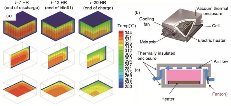 圖14 (a) 充放電過(guò)程中電池保溫箱內(nèi)部溫度場(chǎng)分布的模擬結(jié)果;(b,c) NGK的L33型模組的風(fēng)道設(shè)計(jì)