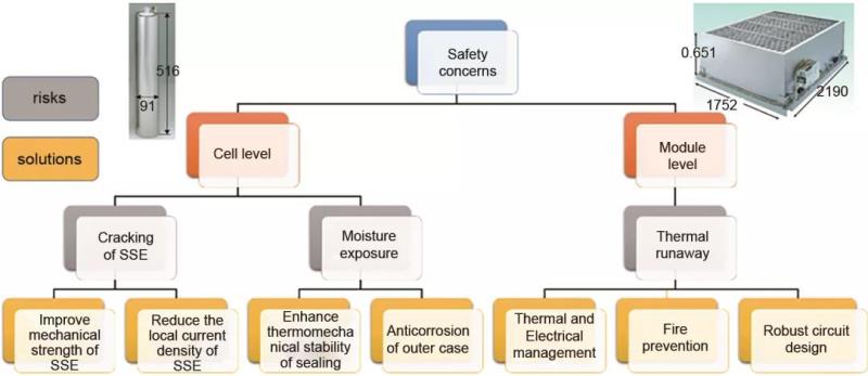 圖7針對(duì)以上兩個(gè)層面所面臨的安全挑戰(zhàn)提出了系統(tǒng)的解決策略。除了傳統(tǒng)的通過(guò)添加鈉芯安全管以限制活性鈉的流動(dòng)以外,在電芯層面,首先需要保證固體電解質(zhì)具有足夠的力學(xué)性能,如抗折強(qiáng)度和斷裂韌性,以及固體電解質(zhì)的抗沖擊能力。其次,減小固體電解質(zhì)在充放電循環(huán)過(guò)程中可能出現(xiàn)的表面局部電流密度集中,以減緩固體電解質(zhì)的電化學(xué)退化速度。再次,需要提高密封部件和電芯外殼的耐熱沖擊性能(抗熱震性能)和耐腐蝕性能,以保證電芯部件在整個(gè)工作溫度范圍內(nèi)的長(zhǎng)期穩(wěn)定。在模組層面,首先對(duì)模組進(jìn)行熱管理是必要的,其次需要對(duì)電池運(yùn)行深度進(jìn)行系統(tǒng)管理,避免電池過(guò)充過(guò)放。再次,一旦模組中個(gè)別電池出現(xiàn)火情,需要保證模組能快速反應(yīng)阻止火勢(shì)蔓延。另外,有效的安全電路設(shè)計(jì)也能在一定程度上提升電池的安全性能。