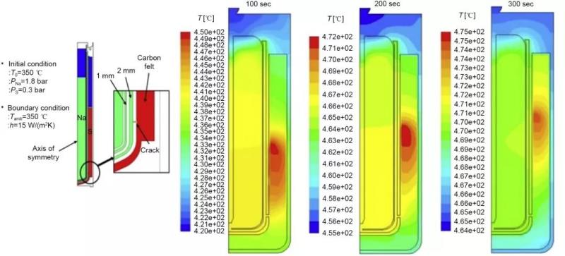 圖6 鈉硫電池運(yùn)行過(guò)程中固體電解質(zhì)裂縫導(dǎo)致溫升的數(shù)值模擬圖