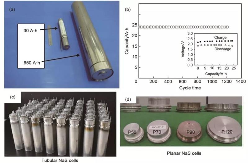 圖5 (a,b) SICCAS開(kāi)發(fā)的30 A·h和650 A·h鈉硫單體電池及其循環(huán)性能;(c,d) RIST開(kāi)發(fā)的管式和平板式鈉硫單體電池