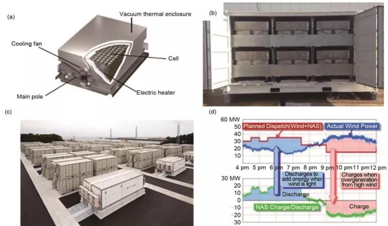 圖4 (a) NGK生產(chǎn)的鈉硫電池模組結(jié)構(gòu)和 (b) 200 kW電池單元;(c) 50 MW/300 MW·h鈉硫電池系統(tǒng);(d) 34 MW/244.8 MW·h鈉硫電池系統(tǒng)為風(fēng)電場(chǎng)提供能量轉(zhuǎn)移和波動(dòng)緩解的運(yùn)行示例