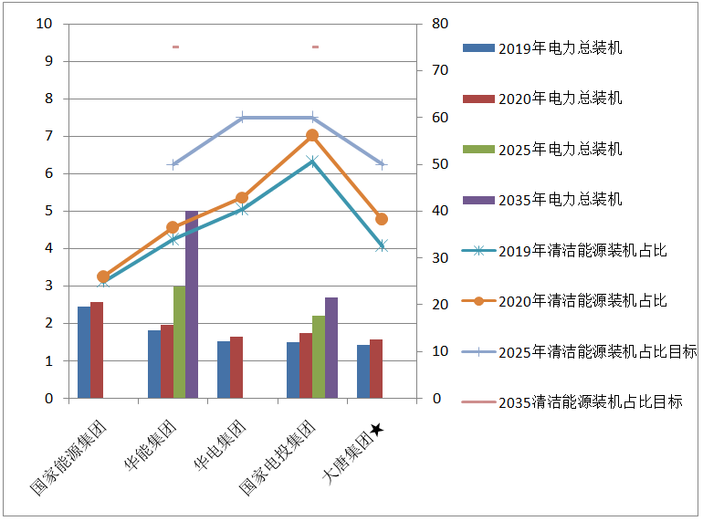 圖1 五大發(fā)電集團2019、2020、2025、2035年電力總裝機及清潔能源裝機占比情況或目標