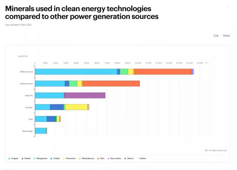 國(guó)際能源署發(fā)表報(bào)告指出,在向清潔能源過(guò)渡的過(guò)程中,關(guān)鍵礦物給能源安全帶來(lái)了新的挑戰(zhàn)。可再生能源所使用的礦產(chǎn)資源類型因技術(shù)而異。鋰,鎳、鈷、錳和石墨對(duì)電池性能、壽命和能量密度至關(guān)重要。稀土元素對(duì)風(fēng)力渦輪機(jī)、電動(dòng)汽車發(fā)動(dòng)機(jī)的永磁體至關(guān)重要。建設(shè)太陽(yáng)能光伏發(fā)電廠、風(fēng)力發(fā)電場(chǎng)、汽車(EV)通常需要比化石燃料更多的礦物質(zhì)。一輛典型的電動(dòng)汽車比傳統(tǒng)汽車需要6倍的礦物投入、陸上風(fēng)力發(fā)電廠需要的礦物資源是燃?xì)獍l(fā)電的9倍。