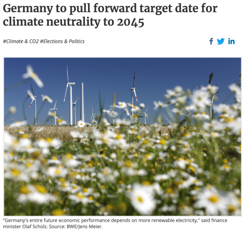 據(jù)cleanenergywire.org網(wǎng)站報道,德國社會民主黨(SPD)和總理默克爾保守黨(CDU/CSU)的政府聯(lián)盟已經(jīng)達(dá)成協(xié)議,向國會提交氣候行動法修改草案。根據(jù)這個草案,德國將在2045年實(shí)現(xiàn)氣候中和,將此前的目標(biāo)提前了5年。德國政府還提出到2030年將排放量減少65%的新目標(biāo)(而目前的目標(biāo)是55%),并提出到2040年前減排88%。