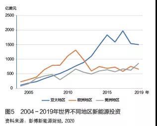 聚焦今后能源轉(zhuǎn)型和發(fā)展的方向,為了更好地解釋各國對于新能源不同的態(tài)度與意愿,本文將投資數(shù)據(jù)作為主要觀測值。在2004-2019年的16年觀測期中,全球新能源投資額總體呈波動上升趨勢(見圖4)。2017年達(dá)到峰值3225億美元,超過2004年的7倍。從增速上看,隨著基數(shù)變大,總體趨勢逐漸放緩。但根據(jù)每年具體情況的不同,同時也受投資周期性的影響,不同年份會有所波動,多數(shù)年份維持正增長,并且半數(shù)年份增速超過10%,整體發(fā)展迅猛。2004到2007年為高速增長期,增速連續(xù)三年超過40%,2008年開始受金融危機影響,全球投資收緊,增速滑坡到21%,并于2009年出現(xiàn)了第一次負(fù)增長,但次年開始反彈。2012年后,歐洲新能源的發(fā)展已經(jīng)進(jìn)入了相對成熟期,《京都議定書》第一承諾期到期,同時由于歐債危機的持續(xù)影響,歐洲各國紛紛縮減新能源補貼,導(dǎo)致新能源投資大幅下滑,拉低了全球投資總量。經(jīng)過3年的調(diào)整,全球新能源補貼普遍削減,歐洲和美洲地區(qū)的投資水平趨于穩(wěn)定,亞太地區(qū)取代歐洲地區(qū),成為投資增長的主要來源,世界新能源發(fā)展進(jìn)入理性增長期。