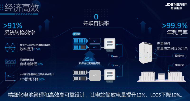 系統(tǒng)采用單組串設(shè)計(jì),并聯(lián)容損為0,最優(yōu)風(fēng)道設(shè)計(jì)和智能環(huán)境溫度控制技術(shù)讓自耗電降低30%;高效多電平拓?fù)浜妥钚p耗變頻調(diào)制技術(shù)、以及PCS與電池組串最優(yōu)擬合技術(shù)讓系統(tǒng)轉(zhuǎn)換效率為91%。