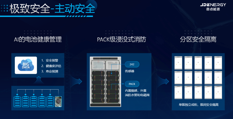 標(biāo)準(zhǔn)化機(jī)柜實(shí)現(xiàn)儲(chǔ)能系統(tǒng)分區(qū)安全隔離,基于單顆電芯的熱管理技術(shù)、9級(jí)主動(dòng)安全監(jiān)控及預(yù)警設(shè)計(jì)、PACK級(jí)浸沒(méi)式專利消防技術(shù)確保系統(tǒng)安全可控。