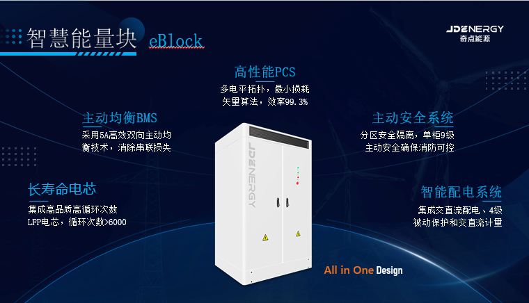 智慧能量塊采用“All in One”的設(shè)計(jì)理念,創(chuàng)新性的將長(zhǎng)壽命電芯,高效雙向均衡BMS,高性能PCS,主動(dòng)安全系統(tǒng),智能配電系統(tǒng)以及熱管理系統(tǒng)融于單個(gè)機(jī)柜,使每個(gè)能量塊都具備能量存儲(chǔ)和交直流功率變換的能力,并可安全、穩(wěn)定、可靠長(zhǎng)期運(yùn)行,通過(guò)交流側(cè)并聯(lián),實(shí)現(xiàn)儲(chǔ)能電站的容量彈性部署。