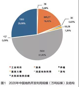 綜合供暖、發(fā)電、溫泉、養(yǎng)殖以及農(nóng)業(yè)等領(lǐng)域地?zé)嵫b機(jī)容量以及供暖制冷面積等數(shù)據(jù)測算,到2020年,中國地?zé)釋?shí)際利用量折合4800萬噸標(biāo)煤,完成規(guī)劃目標(biāo)的近70%。現(xiàn)有地?zé)崮芾媒Y(jié)構(gòu)中,淺層地?zé)崂梦痪邮孜?,占?2%;其次是水熱型地?zé)峁┡?,占?7%,繼續(xù)保持增長;再次是溫泉利用,占比18%,其余利用方式占比3%(見圖1)。